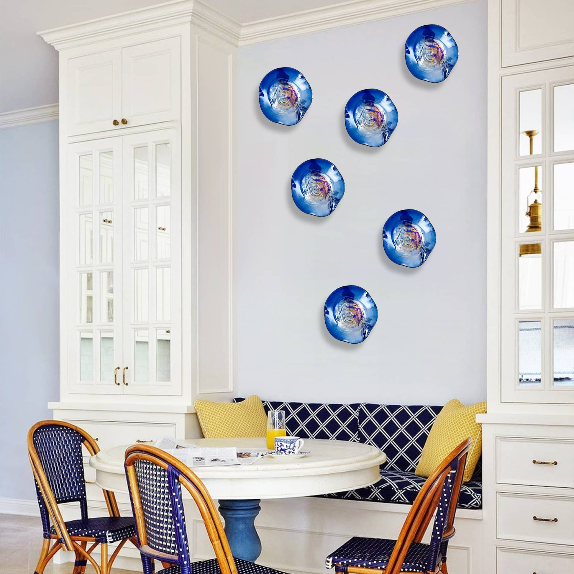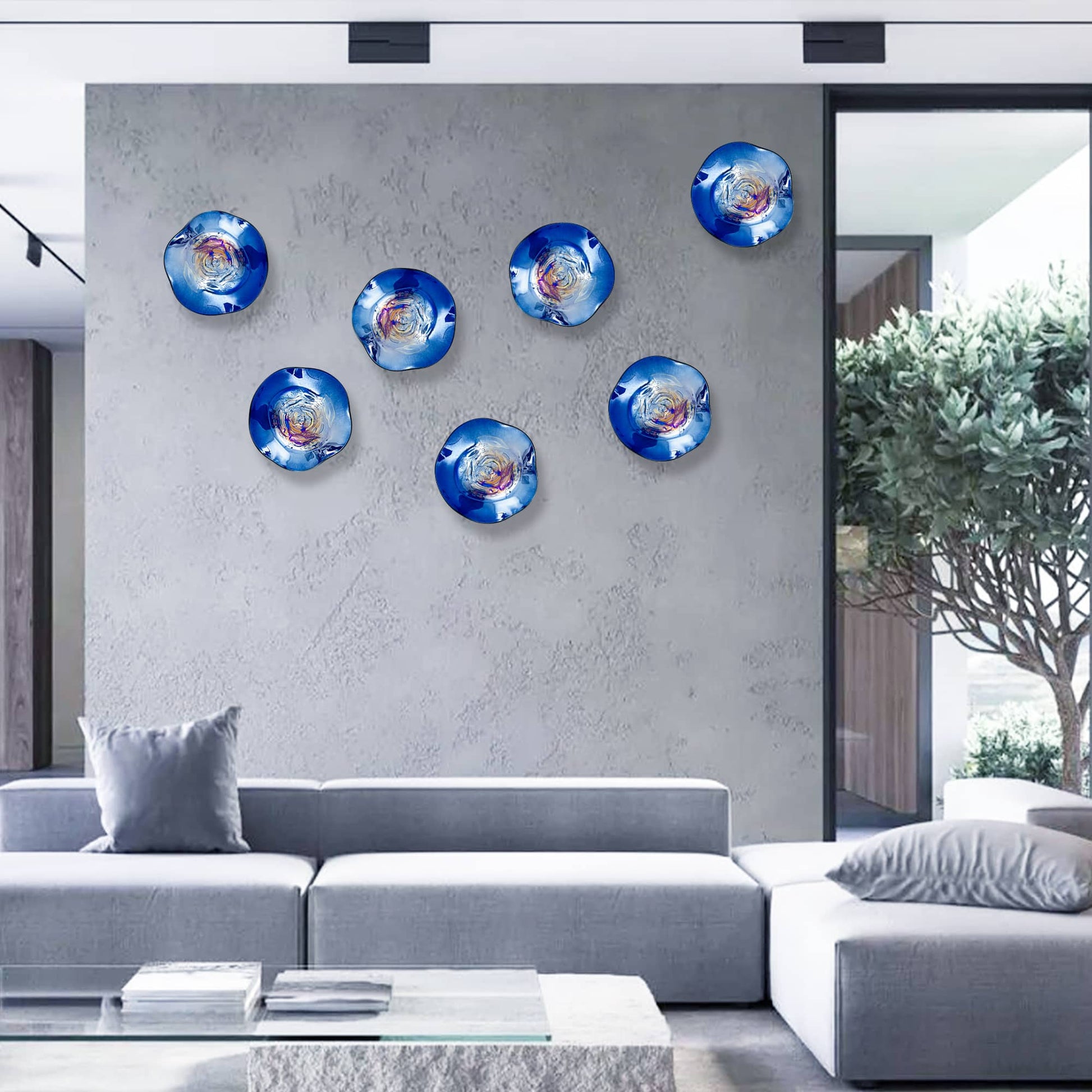 A deep cobalt-blue wall plate with an opal-like iridescent center that shifts through rainbow tones as light moves across the surface. Sculptural, calming, and quietly dramatic—this piece turns a blank wall into a curated design moment.
