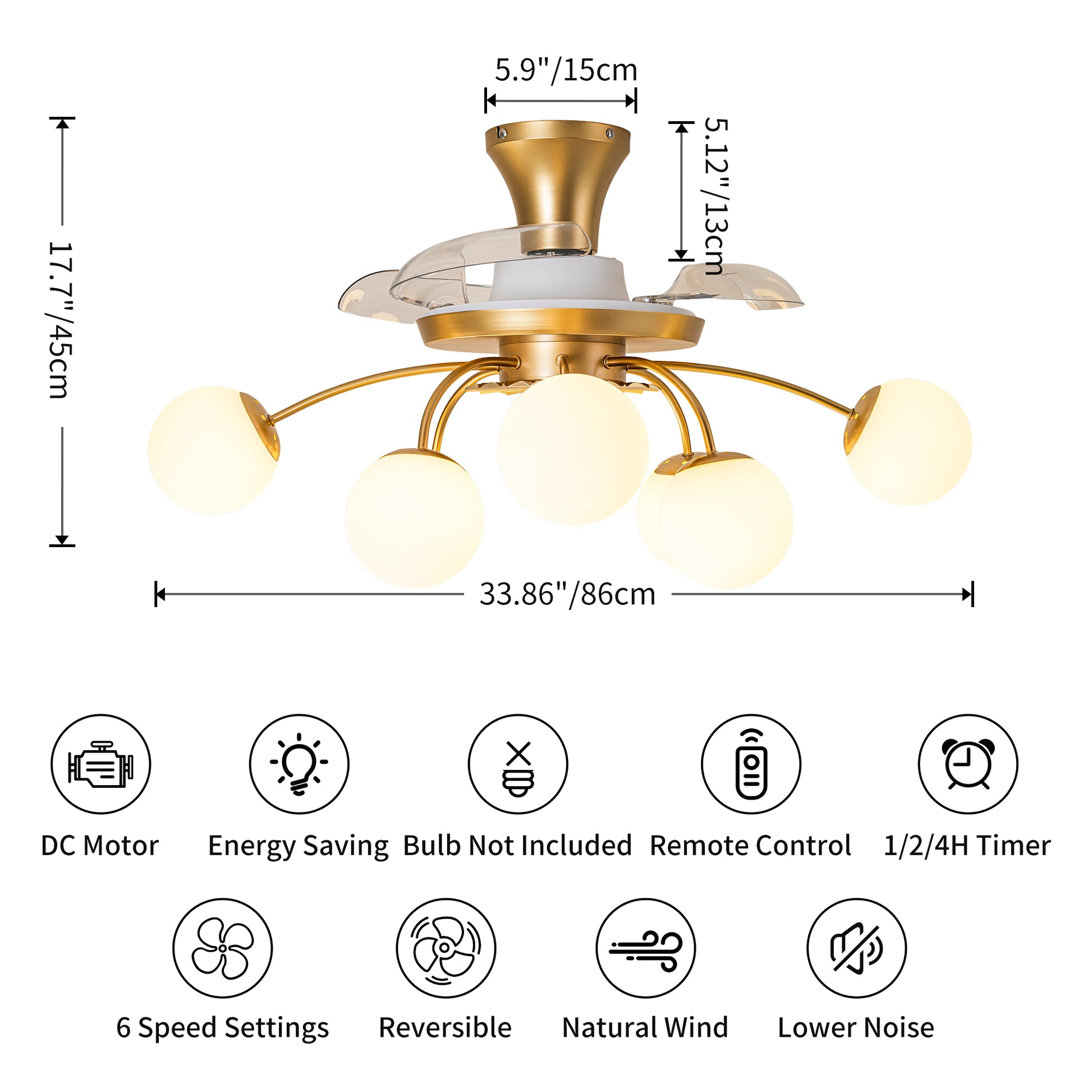 Bring comfort and soft modern style together with this gold retractable ceiling fan light. Designed with a warm brushed gold finish, white globe shades, and a compact flush-mount profile, it offers a lighter and more welcoming look than darker fan lights, making it especially well-suited to bedrooms, guest rooms, living rooms, reading spaces, and other everyday interiors.