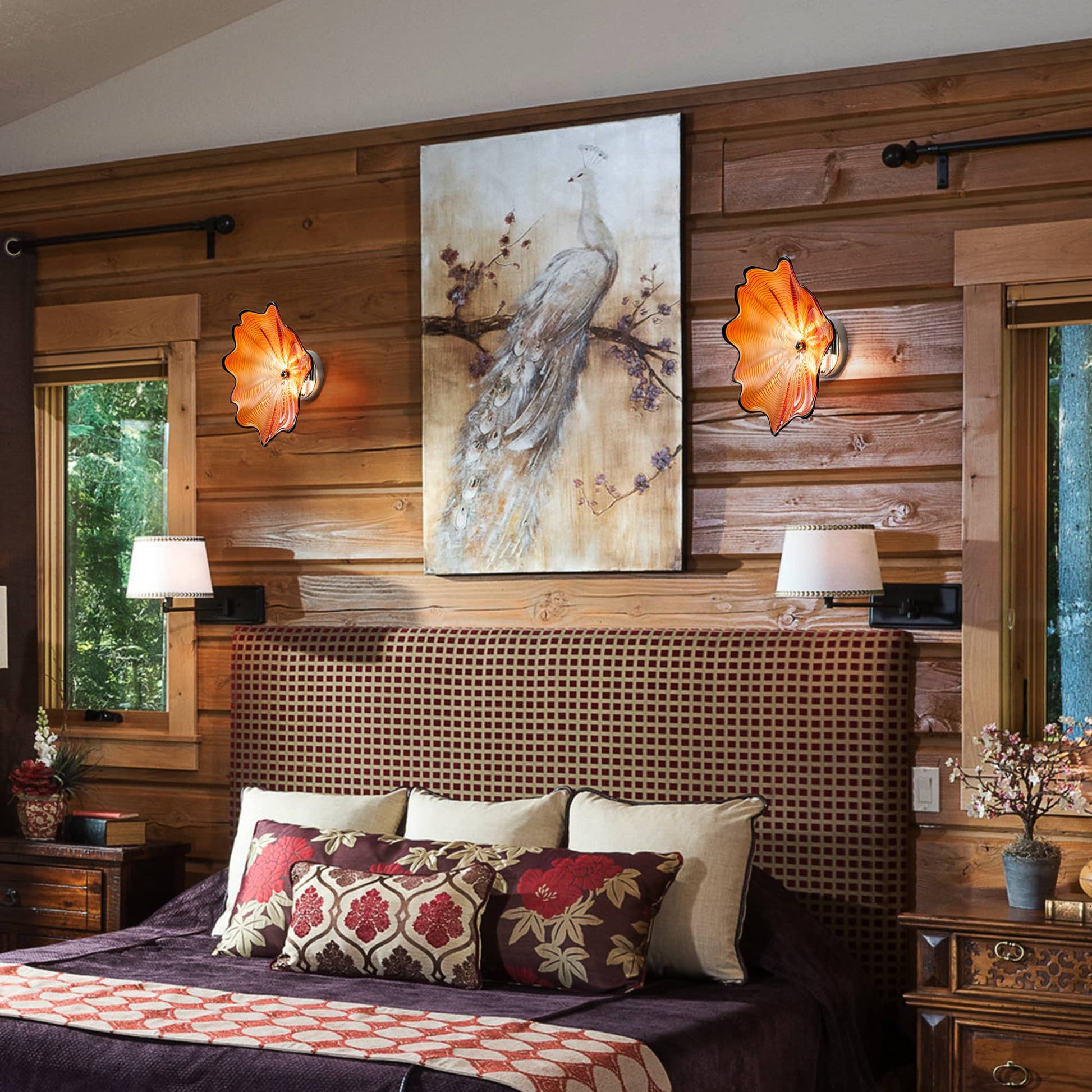 By day, the vivid orange glass swirls with a visible energy, sharply contained by a graphic black rim. By night, the integrated dual G9 LED lighting ignites the piece from within. The orange glass glows with a fiery, ember-like translucency, while the opaque black edge creates a dramatic silhouette that separates the "fire" from your wall.